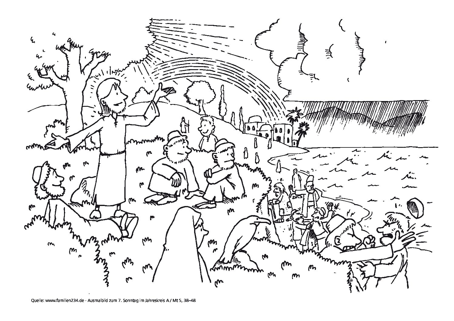In quel tempo, Gesù disse ai suoi discepoli: «Avete inteso che fu detto: “Occhio per occhio e dente per dente”. Ma io vi dico di non opporvi al malvagio; anzi, se uno ti dà uno schiaffo sulla guancia destra, tu pórgigli anche l’altra, e a chi vuole portarti in tribunale e toglierti la tunica, tu lascia anche il mantello. E se uno ti costringerà ad accompagnarlo per un miglio, tu con lui fanne due. Da’ a chi ti chiede, e a chi desidera da te un prestito non voltare le spalle. Avete inteso che fu detto: “Amerai il tuo prossimo e odierai il tuo nemico”. Ma io vi dico: amate i vostri nemici e pregate per quelli che vi perseguitano, affinché siate figli del Padre vostro che è nei cieli; egli fa sorgere il suo sole sui cattivi e sui buoni, e fa piovere sui giusti e sugli ingiusti. Infatti, se amate quelli che vi amano, quale ricompensa ne avete? Non fanno così anche i pubblicani? E se date il saluto soltanto ai vostri fratelli, che cosa fate di straordinario? Non fanno così anche i pagani? Voi, dunque, siate perfetti come è perfetto il Padre vostro celeste».