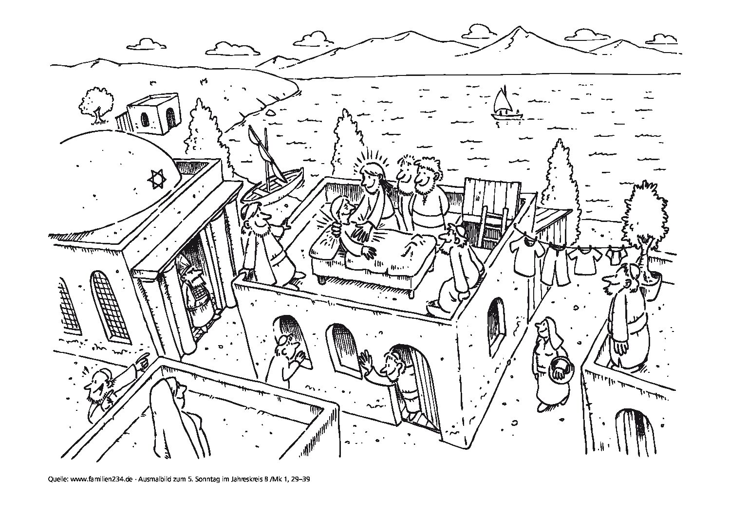 In quel tempo, Gesù, uscito dalla sinagoga, subito andò nella casa di Simone e Andrea, in compagnia di Giacomo e Giovanni. La suocera di Simone era a letto con la febbre e subito gli parlarono di lei. Egli si avvicinò e la fece alzare prendendola per mano; la febbre la lasciò ed ella li serviva.