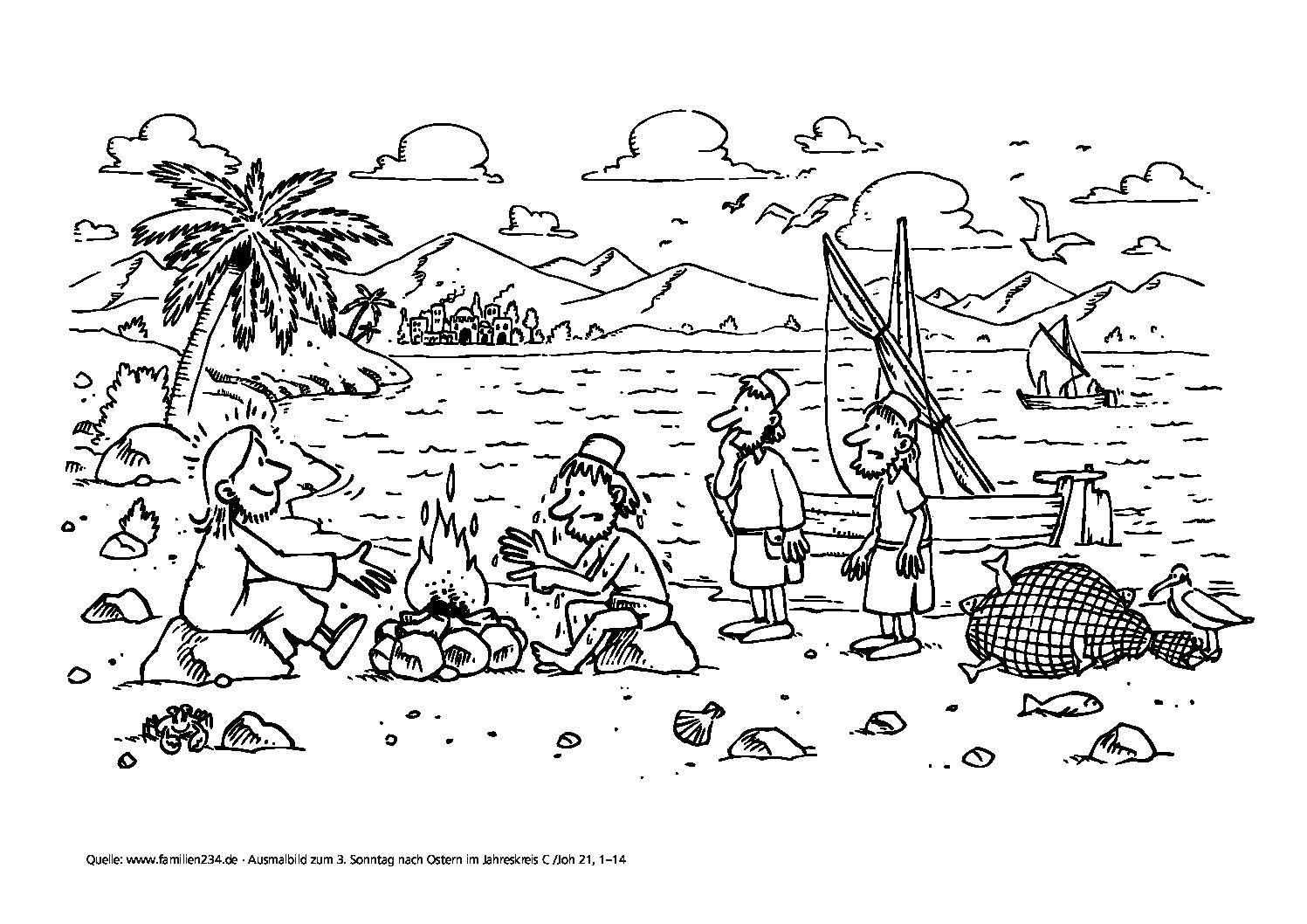 Quando già era l’alba, Gesù stette sulla riva, ma i discepoli non si erano accorti che era Gesù. Gesù disse loro: «Figlioli, non avete nulla da mangiare?». Gli risposero: «No». Allora egli disse loro: «Gettate la rete dalla parte destra della barca e troverete». La gettarono e non riuscivano più a tirarla su per la grande quantità di pesci. Allora quel discepolo che Gesù amava disse a Pietro: «È il Signore!». Simon Pietro, appena udì che era il Signore, si strinse la veste attorno ai fianchi, perché era svestito, e si gettò in mare. Gli altri discepoli invece vennero con la barca, trascinando la rete piena di pesci: non erano infatti lontani da terra se non un centinaio di metri.